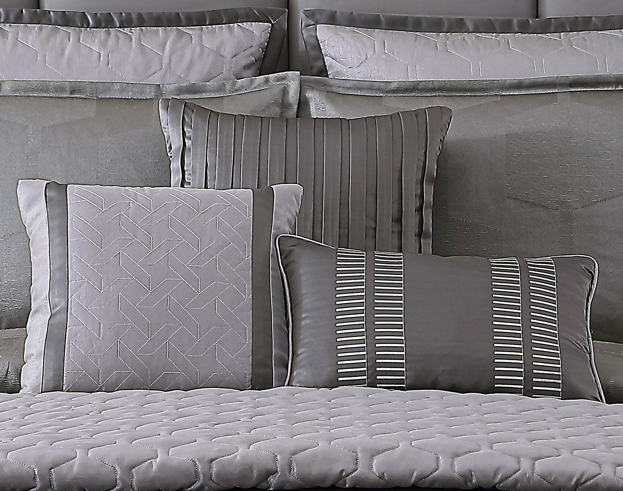 - 1 King Comforter (110-in W X 96-in L), 2 King Shams (20-in W X 36- in L), 2 Euro Shams (26-in W X 26-in L), 1 Square Pillow (18-in W X 18-in L), 1 Square Pillow (16-in W X 16-in L) , 1 Boudoir Pillow (12-in W X 18-in L), 1 King Skirt (78-in W X 80-in L + 15-in Drop), 1 King Coverlet ( 104-in W X 90-in L)
