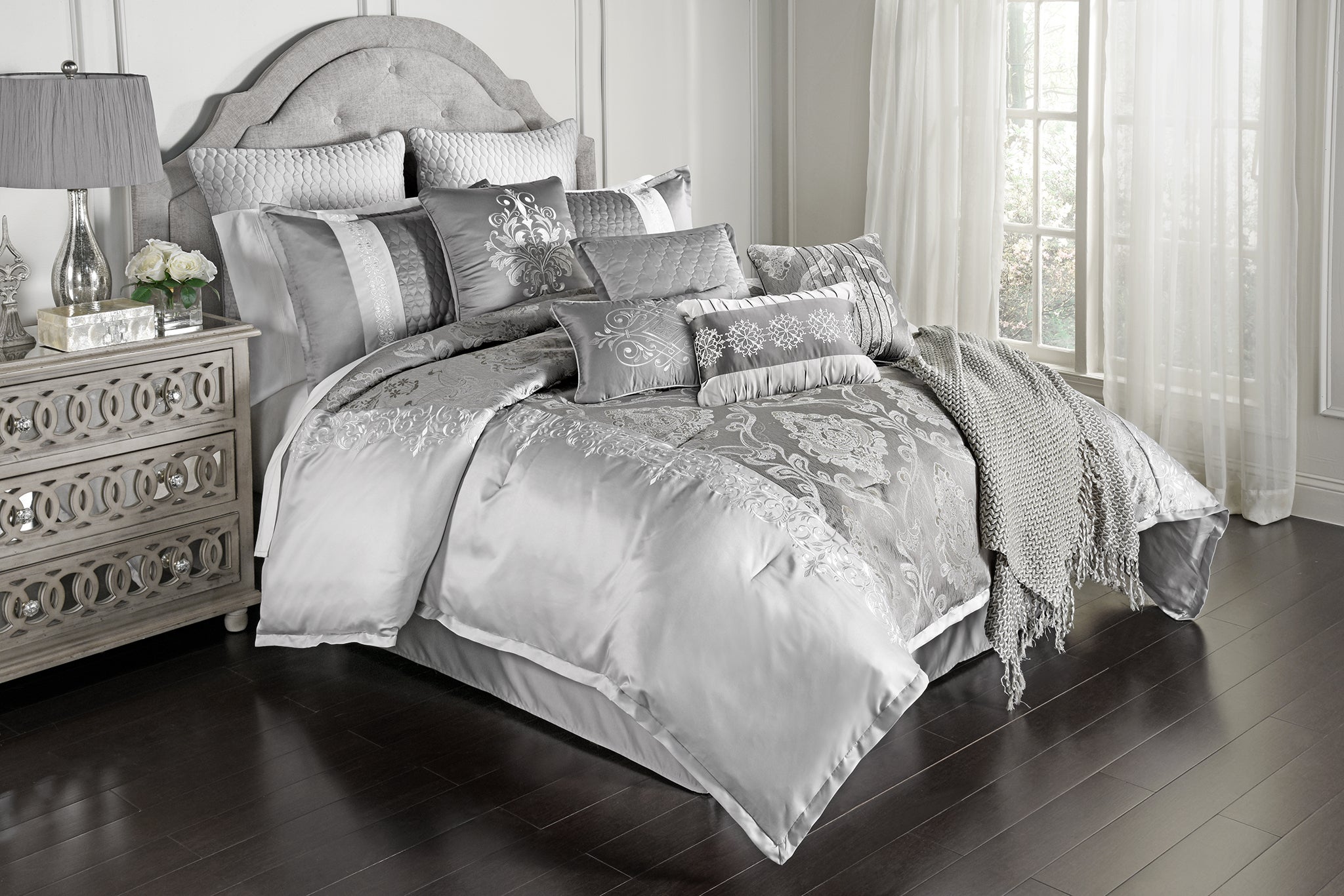 - 1 King Comforter (110-in W X 96-in L), 2 King Shams (20-in W X 36- in L), 2 Euro Shams (26-in W X 26-in L), 1 Square Pillow (18-in W X 18-in L), 1 Square Pillow (17-in W X 17-in L), 1 Square Pillow (16-in W X 16-in L), 1 Boudoir Pillow (13-in W X 21-in L), 1 Boudoir Pillow (12-in W X16-in L), 1 King Skirt (78-in W X 80-in L + 18-in Drop), 1 Throw (50-in W X 60-in L)