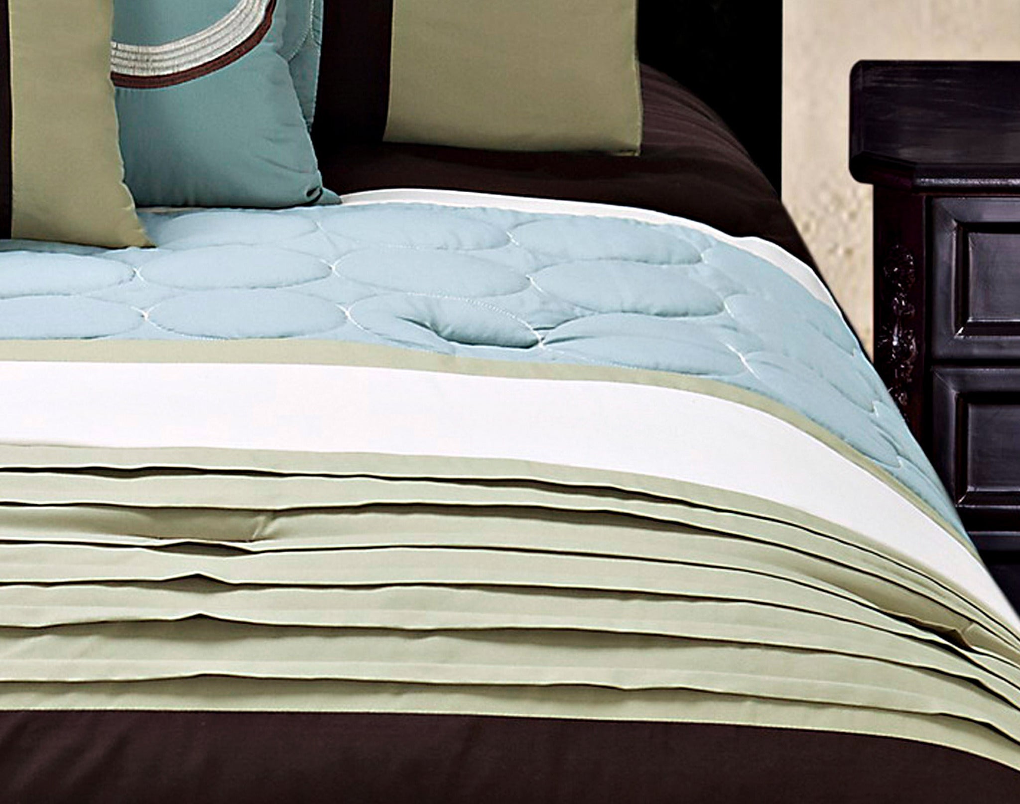 - 1 King Comforter (106-in W X 92-in L), 2 King Shams (20-in W X 36- in L), 1 Square Pillow (18-in W X 18-in L), 1 Boudoir Pillow (12-in W X 18-in L), 1 King Skirt (78-in W X 80-in L + 15-in Drop)