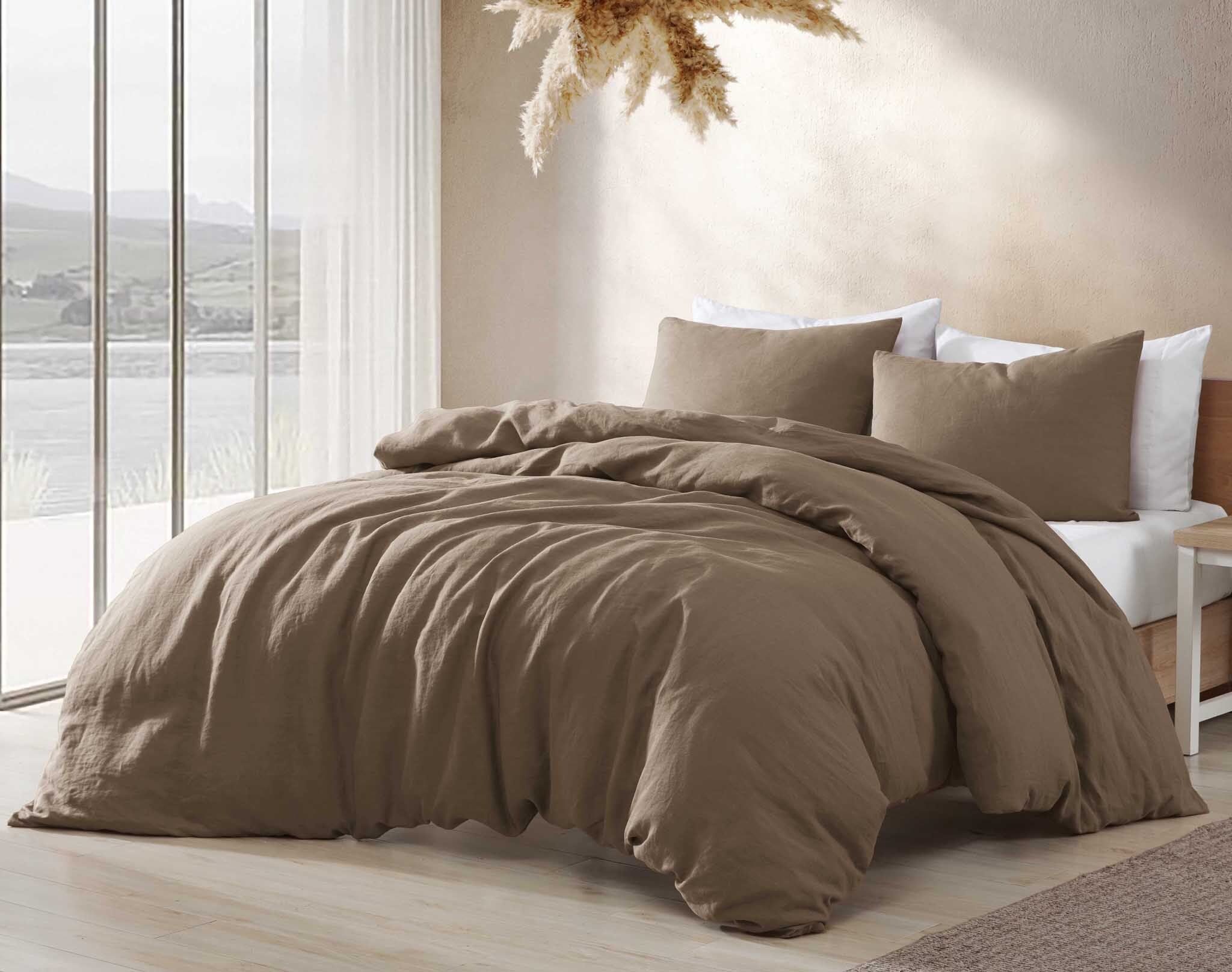 Content:100% Linen Face/100% Cotton Back; Filler: 100% polyester face/100% polyester filling; Care: "Use front load commercial washer and dryer, machine wash cold delicate, wash with like colors, Only non-chlorine bleach when needed, tumble dry low, remove promptly."