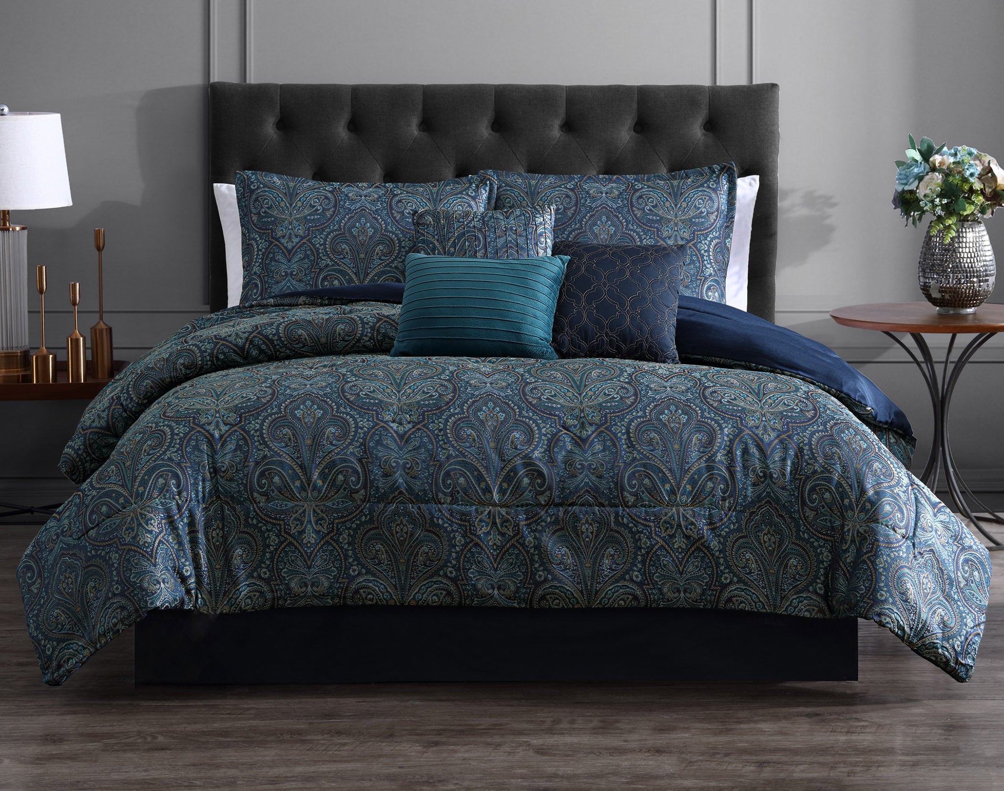 • 1 King Comforter (104-in W X 92-in L), 2 King Shams (20-in W X 36- in L), 1 Square Pillow (16-in W X 16-in L), 1 Boudoir Pillow (12-in W X 16-in L), 1 Square Pillow (10-in W X 12-in L), 1 King Skirt (78-in W X 80-in L + 15-in Drop)