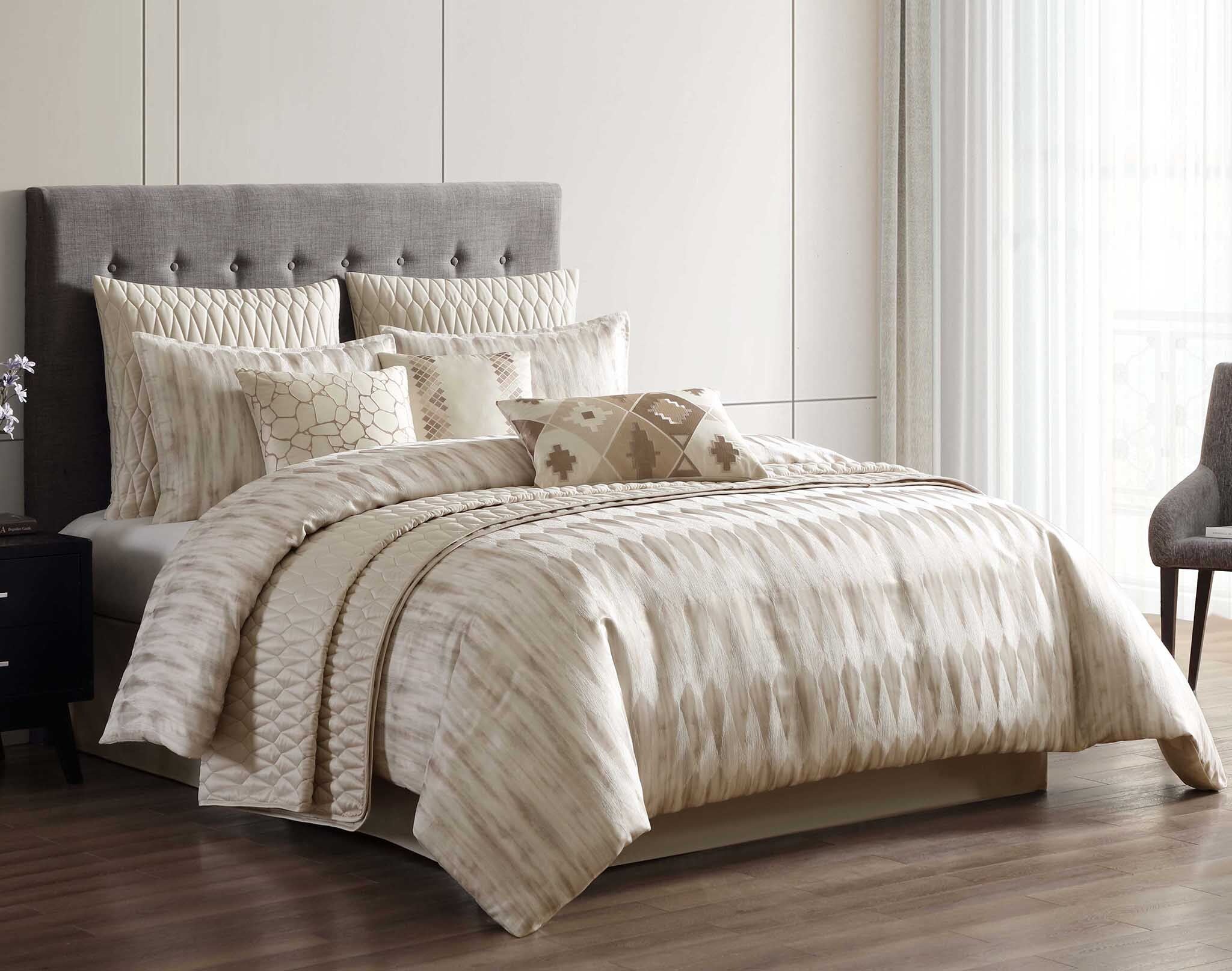 - 1 King Comforter (110-in W X 96-in L), 2 King Shams (20-in W X 36- in L), 2 Euro Shams (26-in W X 26-in L), 1 Square Pillow (18-in W X 18-in L), 1 Square Pillow (16-in W X 16-in L) , 1 Boudoir Pillow (14-in W X 22-in L), 1 King Skirt (78-in W X 80-in L + 18-in Drop), 1 King Coverlet ( 104-in W X 90-in L)