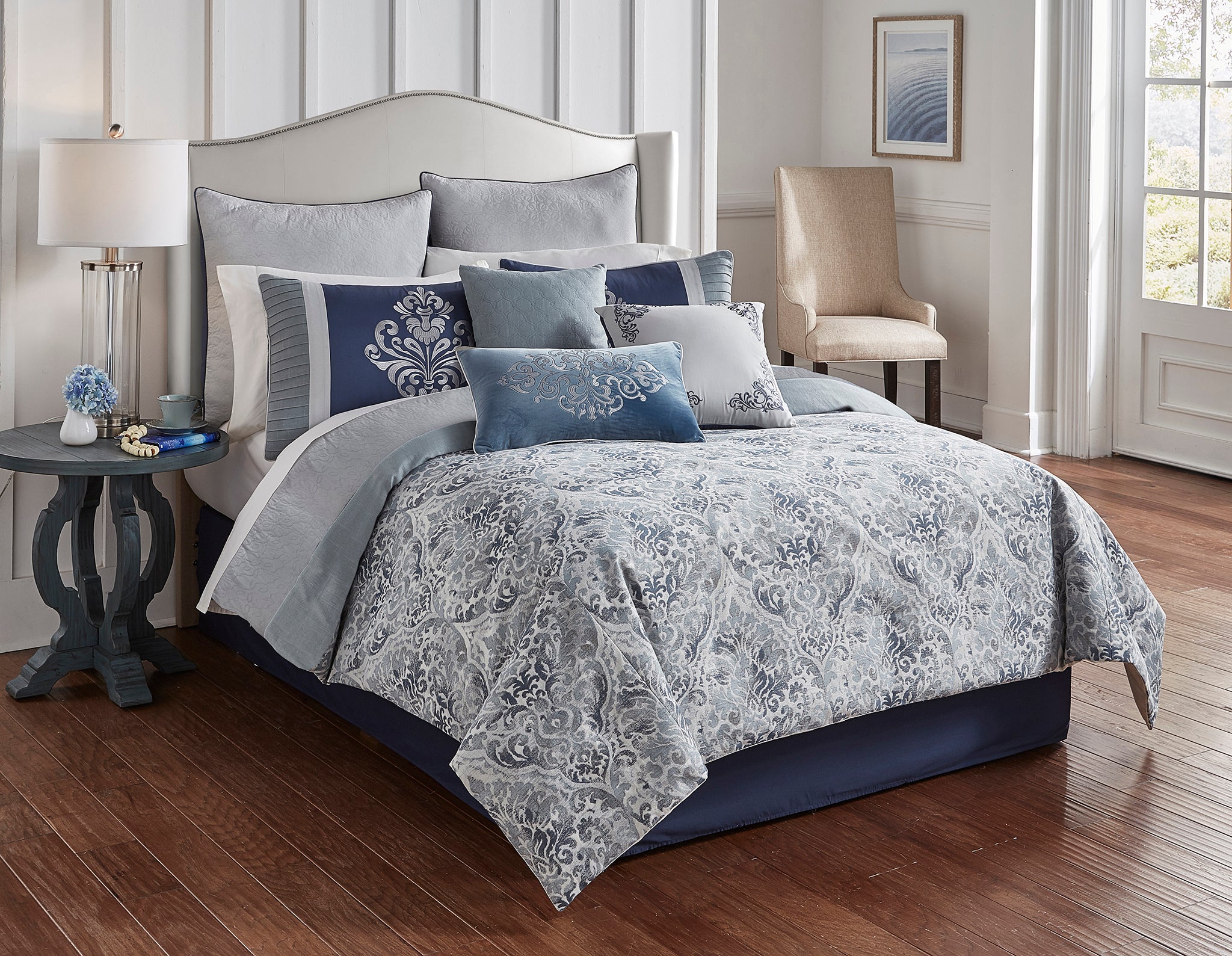 - 1 Queen Comforter (96-in W X 92-in L), 2 Standard Shams (20-in W X 26-in L), 2 Euro Shams (26-in W X 26-in L), 1 Square Pillow (18-in W X 18-in L), 1 Boudoir Pillow (12-in W X 18-in L), 1 Square Pillow (14-in W X 14-in L), 1 Queen Skirt (60-in W X 80-in L + 18-in Drop)