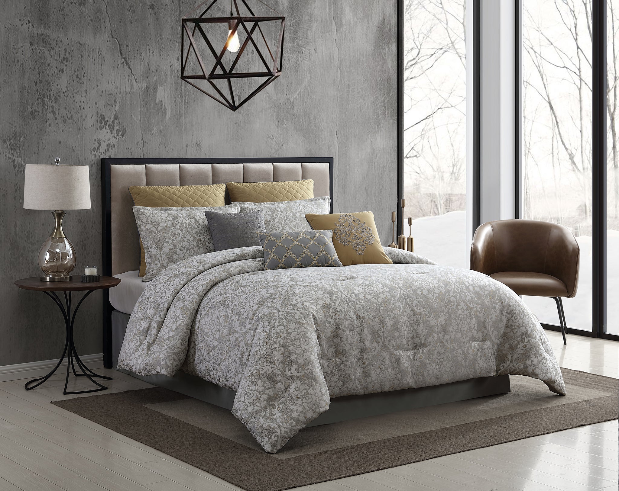 - 1 King Comforter (110-in W X 96-in L), 2 King Shams (20-in W X 36- in L), 3 Euro Shams (26-in W X 26-in L), 1 Square Pillow (18-in W X 18-in L), 1 Rectangle Pillow (13-in W X 22-in L), 1 King Skirt (78-in W X 80-in L + 18-in Drop)
